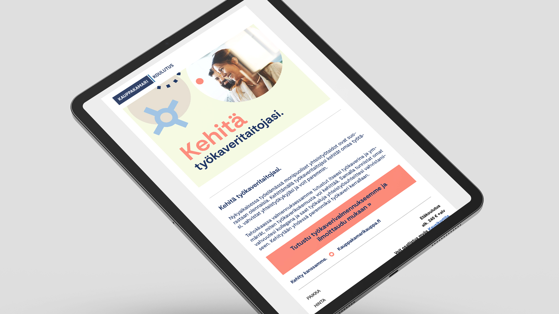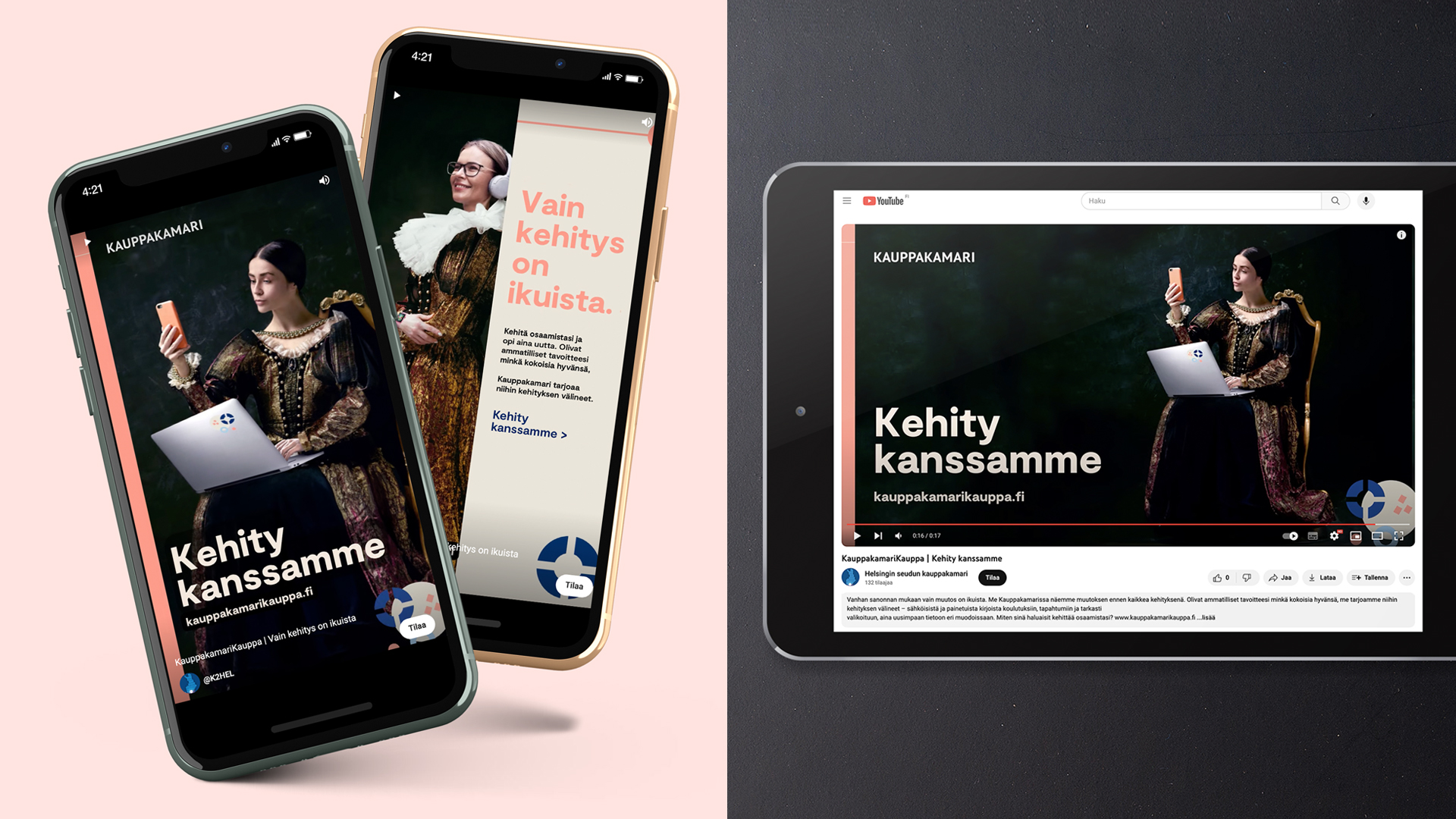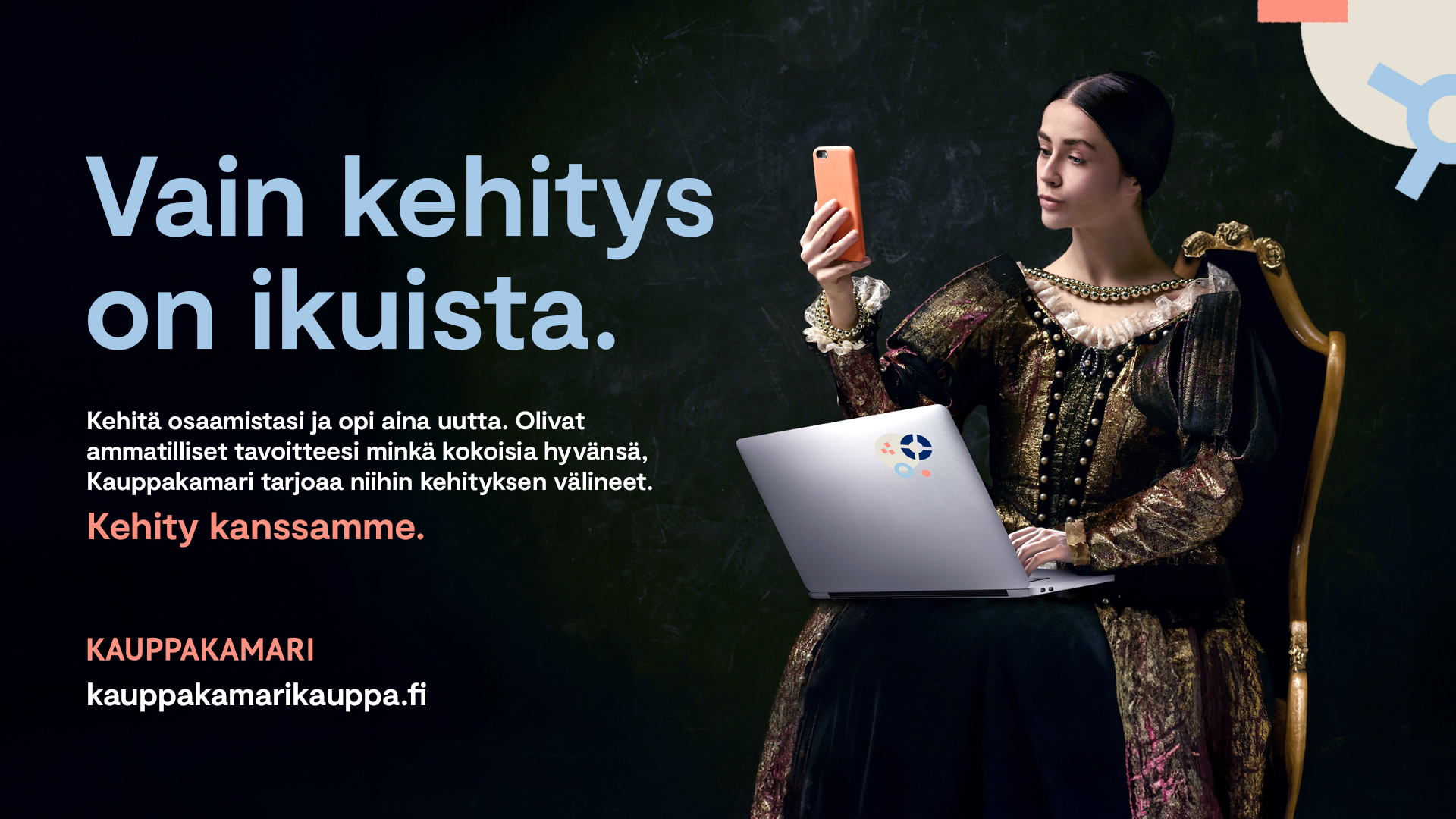 Kauppakamarin uusi markkinointiviestinnän konsepti tiivistyy sanaan ”Kehitys”. Se viestii tehokkaan erottuvasti siitä, miten Kauppakamarin tuote- ja palvelutarjonta tähtää sekä yksilöiden että yritysten kehittymiseen tiedon ja kouluttautumisen avulla.